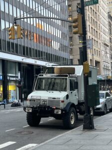 Das nächste Abenteuer steht nun kurz bevor. Wir haben uns ja vorgenommen, mit dem Unimog nach New York City zu fahren, weil hinfliegen kann ja schließlich jeder. Bis ganz hinein nach Manhattan wollen wir fahren. Wie oft haben wir im Vorfeld der Reise mit unseren Freunden darüber geredet und wie kleinlaut sitze ich jetzt stocksteif auf meinem Beifahrersitz. Mitten im Gewühl der unzähligen highways, im Vorstadtwahnsinn des „Big Apples“ überrollt mich die Angst vor der eigenen Courage wie eine Welle, die mich sprachlos macht. Ich sehe überall nur noch Gefahren, links und rechts leuchten Verbotstafeln auf: „Trucks use other highway“, „Trucks must exit here, low bridges ahead“ blinkt es rot vor uns, ein Riesenleuchtschild nach dem anderen kündigt die niedrigen Brücken an. Wir haben ausgerechnet, dass wir nur unter Brücken durchfahren dürfen, die mindestens 11 inch hoch sind. Warum haben diese Amerikaner nur so viele Brücken über ihren highways und warum haben sie die nicht wenigstens höher gebaut, die können doch alle noch nicht so alt sein, das ist doch eine junge Nation… ?!. Vor uns taucht schon die nächste Brücke auf – Hilfe! 12-10 inch, also 12 inch nur in der Mitte, wir sind aber auf der ganz rechten Spur und überall um uns sind Autos…! Ich schicke ein Stoßgebet zum Himmel und wünsche mich in ein Flugzeug. Warum nur muss es immer das Extreme für uns zwei sein?! Karl wechselt die Spur Richtung Mitte, rund um uns wird wütend gehupt und schon sind wir  im Tunnel. Ich ziehe instinktiv den Kopf ein und – Gott sei Dank, es hat nicht gekracht und wir sind durch. Im Geiste sehe ich schon die Schlagzeile: „Zwei Österreicher missachten sämtliche Warnungen und müssen von der New Yorker Feuerwehr unter einer Brücke vom highway geborgen werden…“. Mein Fels in der Brandung in diesem ganzen Wahnsinn ist Karl. Er ist voll konzentriert aber völlig ruhig und sucht sich unbewegt den Weg durch diese Menge von Fahrzeugen. „Da kommt die nächste Bücke“, schreie ich inzwischen völlig aufgelöst, „da steht 9 inch, was machen wir denn jetzt“? „Na, dann umfahren wir sie halt“, antwortet Karl gelassen, zieht nach rechts in die Ausfahrt neben uns, umfährt irgendwie die Brücke und ist schon wieder drauf auf dem highway. Er ignoriert völlig die hysterischen Ausbrüche die von der Beifahrerseite kommen, er kennt mich gut genug, um zu wissen, dass ich in solchen Situationen gerne mal die Nerven wegschmeisse. Ich bin schweißgebadet und völlig am Ende, was würde ich nur ohne ihn machen… . Je näher wir Manhattan kommen, desto mehr bessert sich eigenartigerweise die Verkehrssituation und ich entspanne mich langsam wieder. Und dann ist tatsächlich der Augenblick da: Wir fahren mit dem Unimog auf dem Broadway mitten durch Manhattan, durch die Schluchten der riesigen Hochhäuser, um uns herum die unzähligen Leuchtreklamen, genau so wie man es aus dem Fernsehen kennt. Wir parken – ziemlich sicher verbotenerweise – mitten vor einer Kreuzung, sozusagen direkt unter der Ampel, vor einem Zebrastreifen – aber gleichzeitig auch unter einem „Broadway“-Schild. Wir hoffen, dass wir nicht gleich abgeschleppt werden,wollen unbedingt kurz aussteigen um ein paar Fotos zu machen und um wenigstens ein Bier trinken zu gehen, bevor wir auf die andere Seite des Hudson River zu unserem Campingplatz weiterfahren. Wild campen in New York City, darauf wollen dann sogar wir uns nicht einlassen… . Wir suchen uns eine Bar, fallen uns um den Hals und stoßen glücklich an auf das gelungene Abenteuer „Mit dem Unimog nach New York City“. Eines ist mir aber natürlich klar: Ohne diesen Mann an meiner Seite bzw. am Steuer wäre das Ganze nur eine verrückte Idee geblieben!