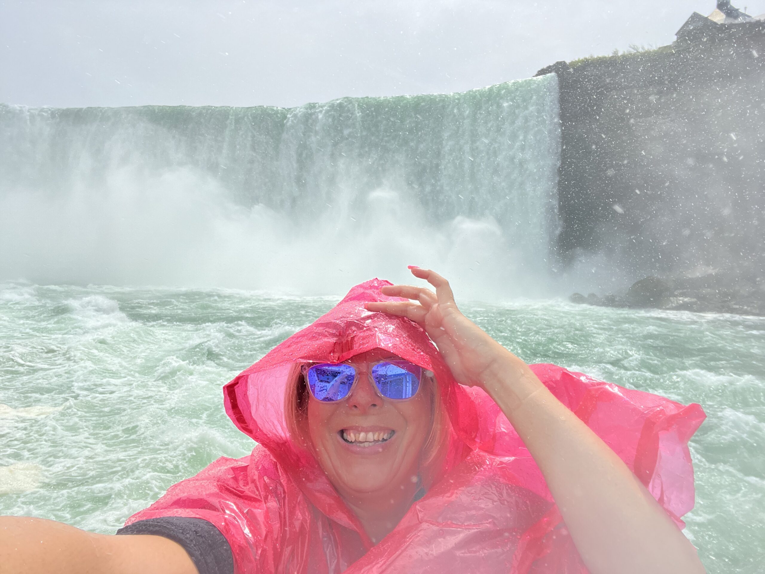 Die Niagarafälle besuchen wir dann bei weiterhin wunderbarem Wetter, so wie wir überhaupt bisher, seit unserer Abreise, mit ganz wenigen Ausnahmen, nur mit Sonnenschein verwöhnt worden sind. Wir fahren sie von der US-Seite an, da sich dort auch unser Campground befindet. Wir haben extra das Wochenende vorübergehen lassen und am Montag sind, wie erhofft, nur wenige Besucher da. Nach den ersten Fotos besuchen wir, sehr edel in gelbes Plastik gehüllt, die „Caves of the wind“, wo man zu Fuß über verschiedene Treppen und Holzplattformen bis ganz nahe an die amerikanischen Fälle herangehen kann. Entsprechend nass begeben wir uns anschließend zum Trocknen in Richtung der „Rainbowbridge“, welche die amerikanische mit der kanadischen Seite der Fälle verbindet. Wir wissen, dass sich die größten Attraktionen und die schönste Aussicht auf der kanadischen Seite befinden und haben vorsorglich unsere Pässe mitgenommen, um nun über die Fußgängerbrücke nach Kanada zu wechseln. Der Grenzübergang – egal ob hin oder zurück – stellt sich dann als relativ harmlos heraus. Die Kanadier wollen bei der Einreise lediglich die Reisepässe und unsere Impfnachweise sehen, die Amerikaner sind bei der Rückkehr in die USA am Abend ebenfalls sehr entspannt, Pässe, ein Foto und das war’s. Der Blick auf die kanadischen „Horseshoe-Falls“ ist dann wirklich noch einmal viel besser als von der amerikanischen Seite. Natürlich muss einem aber klar sein, dass das Naturschauspiel der Niagarafälle durch die fast abartige Vermarktung teilweise nahezu in den Hintergrund rückt. Man fühlt sich wie mitten im Wiener Prater zwischen Riesenrad, Geisterbahn, Souvenirshops und riesigen Hotelkästen und Casinos. Aber bei der Fahrt bis ganz nahe an die Wasserfälle mit der „Maid of the mist“auf amerikanischer Seite oder mit der „Hornblower“ bei den Kanadiern ist das alles vergessen. Man fühlt sich wie mitten im Auge eines Orkans, das schäumende Wasser brodelt rund um das Schiff, man spürt hautnah dessen unvorstellbare Kraft, wenn der Wind einem die Wasserfontänen waagrecht ins Gesicht peitscht. Man mag von der disneylandartigen Vermarktung der Fälle halten was man will – Alleine für dieses eine Erlebnis hat sich für uns der Besuch auf jeden Fall gelohnt!