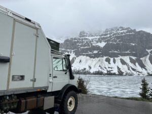 Irgendwie können wir uns beim besten Willen nicht ganz anfreunden mit diesem touristischen Gebiet der Nationalparks und, da das Wetter zum Wandern sowieso zu schlecht ist, entschließen wir uns, weiter Richtung Norden zu fahren. Schon nach zwei Nächten am Campingplatz reicht es uns mit der Bevormundung und wir übernachten ab diesem Zeitpunkt wieder freistehend, gleich einmal am 2.100 m hohen Sumwapta Pass, bei kuscheligen 4 Grad. Am nächsten Morgen freut sich der Unimog so gar nicht über das Starten, braucht zum ersten Mal ein paar Versuche und nebelt die ganze Gegend mit Qualm ein. Hmmm, wenn er sich damit jetzt schon schwertut, wie wird das dann erst in den Anden in Südamerika werden, denken wir kurz – Aber bis dahin rinnt ja noch jede Menge Schneewasser die Rocky Mountains hinunter,….  . Wir folgen dem „Icefield Parkway“ nach Norden, die Sicht auf die Gipfel der Rockys bleibt weiterhin meistens getrübt, zum Abschluss versöhnt uns aber ein Besuch des „Columbia Icefields“ mit dem – für uns – insgesamt eher bescheiden gebliebenen Nationalparkerlebnis. Auf den Gletscher steigen wir, entgegen aller Vorschriften, alleine und übersehen geflissentlich alle Tafeln mit „Guided groups only“. Wir steigen selbstständig bis ca. zur Hälfte des Eisfeldes hinauf und beobachten dabei die armen Gruppentouristen, die für viel Geld mit Bussen bis hinauf gekarrt werden und dann oben kurz am Gletscher spazieren gehen dürfen, bevor sie wieder mit dem Bus nach unten fahren müssen. Die grandiosen Wasserfälle der „Athabasca Falls“ bilden einen würdigen Abschluss, bevor wir den Nationalparks endgültig den Rücken kehren.