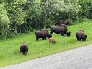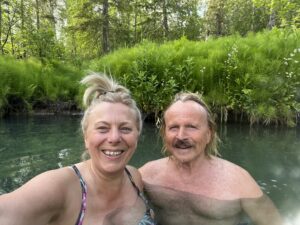 Tatsächlich erleben wir auf dem kommenden Abschnitt des „Alaska-Highways“ dann laufend grandiose Eindrücke. Wir passieren den jadefarbenen „Muncho-Lake“, sehen Herden von Waldbüffeln direkt neben der Straße und stoppen auf ein heißes Bad bei den „Liard River Hot Springs“. Hier haben wir gleich doppelten Grund zum Feiern: Es ist der 21. Juni, somit Sonnenwende und wir haben heute die 10.000 km Marke unserer Reise überfahren. Nachdem wir die heißen Quellen inmitten ihrer großartigen, tropischen Vegetation genossen haben, entzünden wir daher ein Sonnwendfeuer und freuen uns, dass wir das in dieser einzigartigen Location feiern können. Wir resümmieren ein bisschen über das bisher Erlebte und kommen drauf, dass wir seit der Abreise nur mehr Musiksender ohne Nachrichten gehört haben und bisher noch kein einziges Mal Bedarf nach Film oder Fernsehen hatten. Wir sind sicher, sollte irgendwann irgendwas wirklich wichtiges auf der Welt passieren, wird uns jemand eine „whatsApp“ schicken – so wie 2020 im März, als wir im australischen outback nicht mitgekriegt haben, dass wegen Corona bereits die halbe Welt lahmgelegt war…. – Und anders möchten wir es ja auch gar nicht haben!