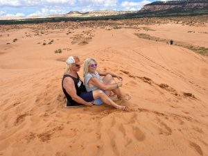 fahren! Zuerst steht aber ohnedies der kräftezehrende Aufstieg auf die höchste Düne bevor. Da wir wieder einmal etwas länger geschlafen haben, ist es schon fast Mittag bis wir beim Anstieg sind und die Sonne brennt gnadenlos herunter. Karl probiert dann erst einmal alleine eine Abfahrt und alles läuft super. Ebenso bei mir, ich sause die riesige Düne hinunter, es ist echt ein Riesenspaß. Wir teilen unser Board dann noch mit einem jungen Paar aus Tirol, die ohne Board auf der Düne auftauchen und sich riesig darüber freuen. Aber dann – Wir beschließen jetzt endlich eine Abfahrt zu zweit zu wagen. Das Board ist ziemlich kurz und wir müssen uns ganz eng zusammenquetschen, gleichzeitig die Füße