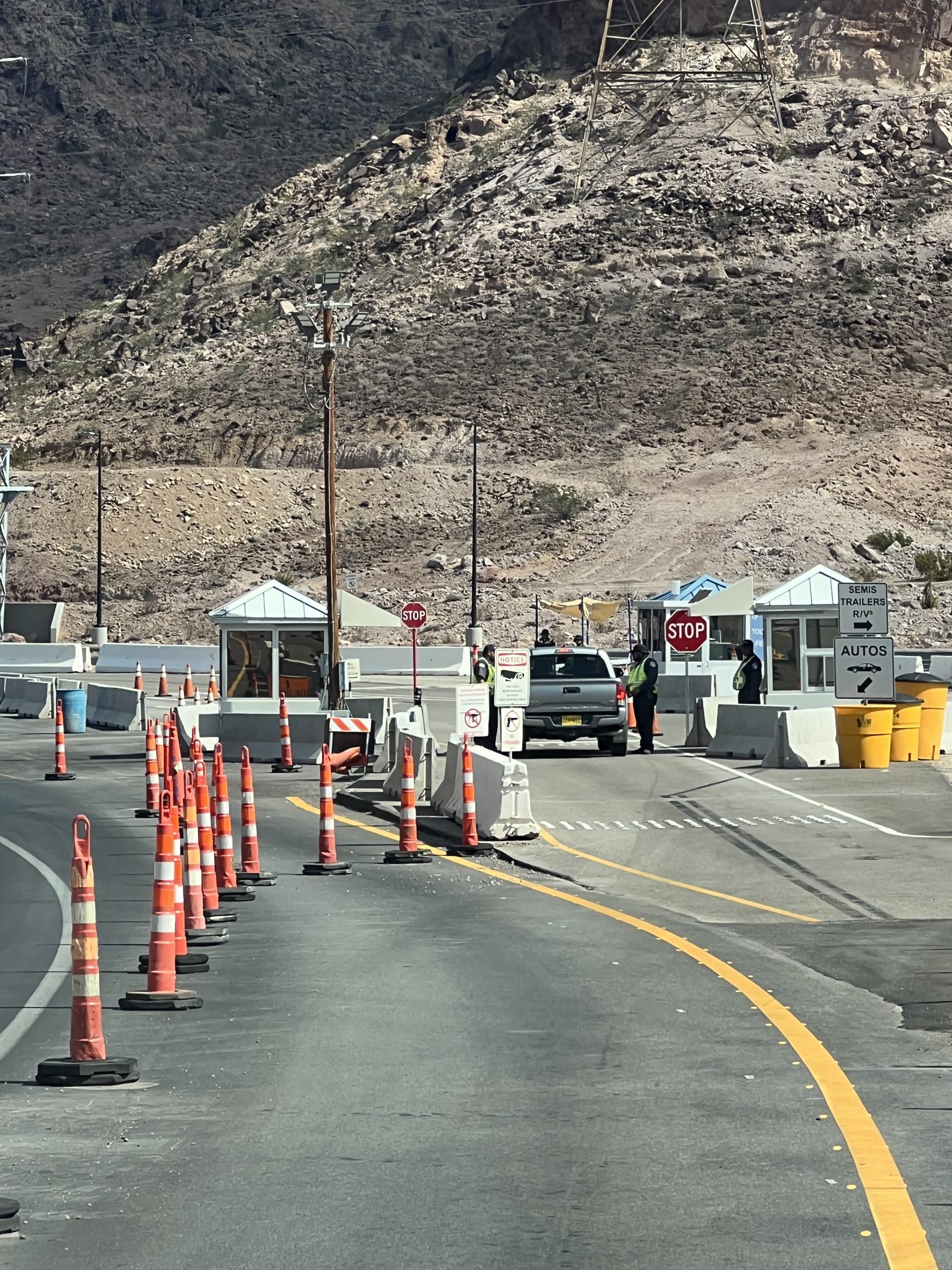 ist das wichtigste Wasserresrvoir für fast drei Millionen Menschen in Las Vegas. Daher gilt er auch als potentielles Terroranschlagsziel und die Sicherheitskontrollen aller Fahrzeuge die zum Damm wollen sind enorm. Wir müssen sogar unsere Dachbox aufmachen, nachdem der Sicherheitsbeamte aber dann nicht recht weiß, wie er dort hinaufsteigen soll, beschränkt er sich darauf den Inhalt mit einem langen Spiegel kurz zu kontrollieren, was zwar völlig sinnlos ist, aber na gut,