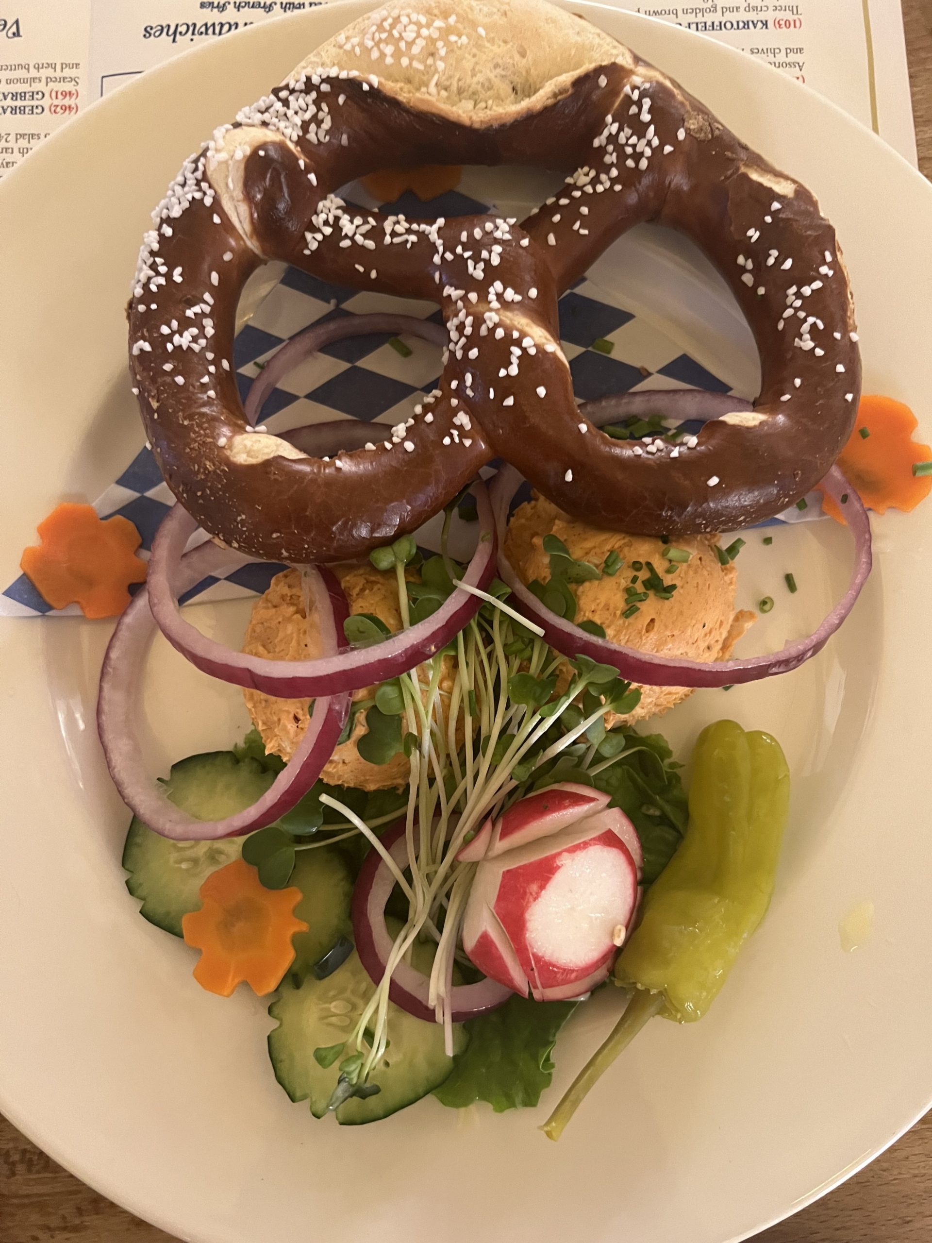 wirklich sehr gut, die Riesenbrezn zum Obatzdn wird wie das Bier direkt aus Deutschland importiert, Karl’s Hendl hat etwas zu viel Geschmacksverstärker abbekommen, mein Schweinsbraten mit den Extra Knödeln ist wirklich super, am Schluss teilen wir uns noch Apfelkücherl mit Vanilleeis und