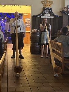 Tag!“. Nach fast sechsmonatiger Österreich-Abstinenz träume ich inzwischen schon manchmal von Schweinsbraten mit Semmelknödeln, das muss ich echt gestehen. Der Nachbau ist dann so authentisch, wir können es fast nicht glauben. Die Musik spielt „Ein Prosit“ und mehr, nicht ganz passend ist dann der Auftritt der Alphornbläser, die zum Abschluss laut „Ricola“