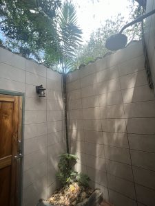 die sauberen Toiletten und die riesigen „open top“-Duschen mit Warmwasser benützen, in denen man beim Duschen über sich in die Bäume des Dschungels schauen kann, wo die Vögel zwitschern. Eigentlich wollten wir uns hier