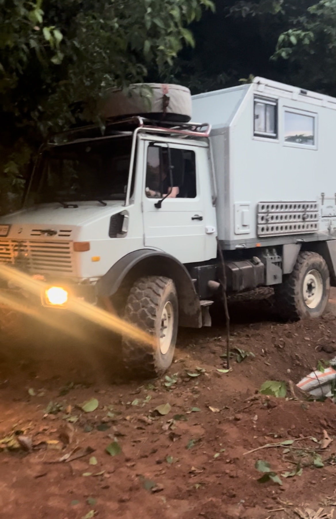 die zu einem Haus mitten im Dschungel führen, für uns angehoben werden. Man wirft uns verwunderte Blicke zu, als hätten die Einheimischen keine Idee, wo diese zwei Fremden mit dem riesigen Auto auf dem viel zu schmalen Weg wohl hinwollen. Die Fahrt ist ohne Übertreibung echte Schwerstarbeit, besonders für Karl, der hier wieder einmal alles geben muss und was unser Unimog hierbei leistet ist einfach nur sensationell. Nach ca. zwei Stunden, wir haben noch nicht ganz zwei Drittel des Weges geschafft, kommen wir an eine Engstelle die mir wirklich echte Angst macht. Ganz eng vorbei an einem Felsen tastet sich der Unimog und trotzdem ist der Radius für das linke Hinterrad an der abfallenden Seite einfach zu eng, sodass ein Teil