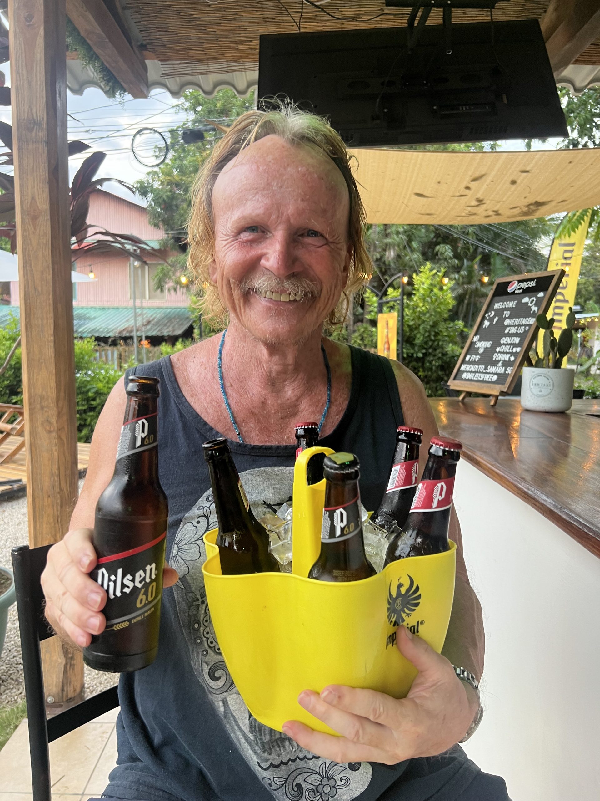 Wäsche. Im Anschluss daran wollen wir eigentlich dann noch am gleichen Tag weiterfahren, da findet Karl beim Warten auf die Wäsche zufällig noch ein sehr nettes Lokal, wo es zur „Happy Hour“ Bier und Erdinger-Weißbier im „Kübelangebot“ zum unschlagbaren Preis gibt, was