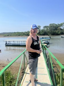 eine „Krokodiltour“ zu unternehmen. Wir haben beide noch nie Krokodile in freier Wildbahn erlebt, also ist uns das den Umweg wert. Als erstes stoppen wir bei der „Crocodile-Bridge“, einer Brücke die einige Kilometer oberhalb der Mündung des „Rio Tarcoles“ über den Fluss führt und wir haben Glück, es ist gerade Ebbe, der Wasserstand ist dadurch auch im Fluss niedrig und eine Menge Krokodile liegen direkt unter der Brücke im flachen Wasser neben den Sandbänken. Selbst aus sicherer Entfernung ist es schon ein bisschen unheimlich, diese Tiere da unten in Lauerstellung versammelt zu sehen. Weiter gehts dann noch ein paar Kilometer flussabwärts bis zum Sitz der „Jungle Crocodile Safari Tours“, wo wir das Glück haben, dass wir bei unserer Tour nur