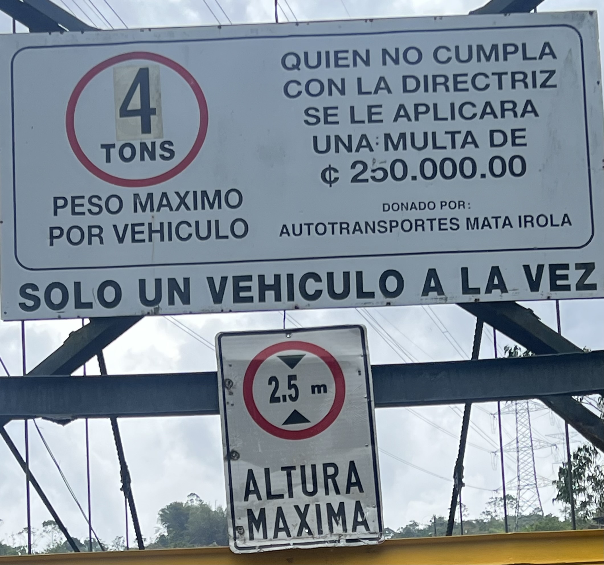 Kilometer begeisterte Ausrufe entlockt. Schließlich erreichen wir den „Cachi-Stausee“, überqueren die Staumauer und wollen auf die andere Seeseite, um dort im Ort „Orosi“ zu übernachten. Nur einen Kilometer vor unserem Ziel werden wir kurz vor dem Ortszentrum aber leider gestoppt: Eine alte Hängebrücke mit einer Höhenbeschränkung von 2,5 m und einer Gewichtsbeschränkung von 4 Tonnen ist leider für den Unimog ein