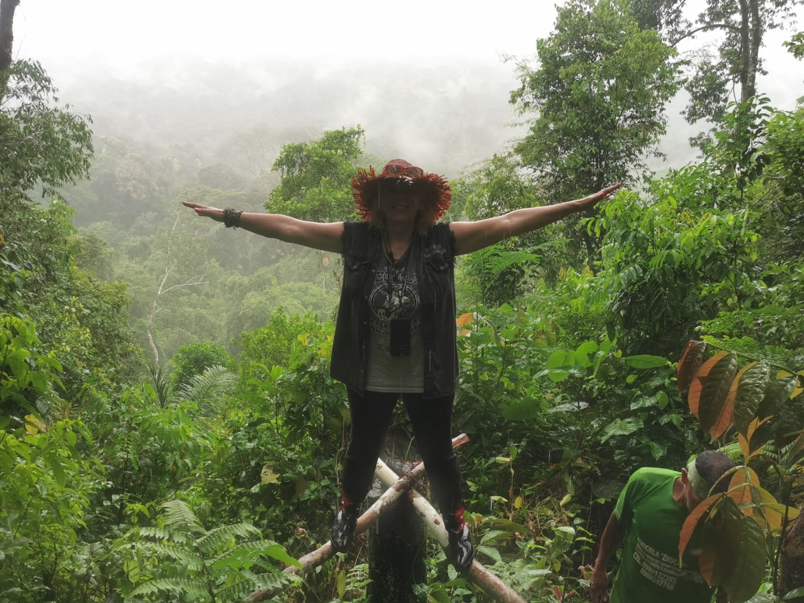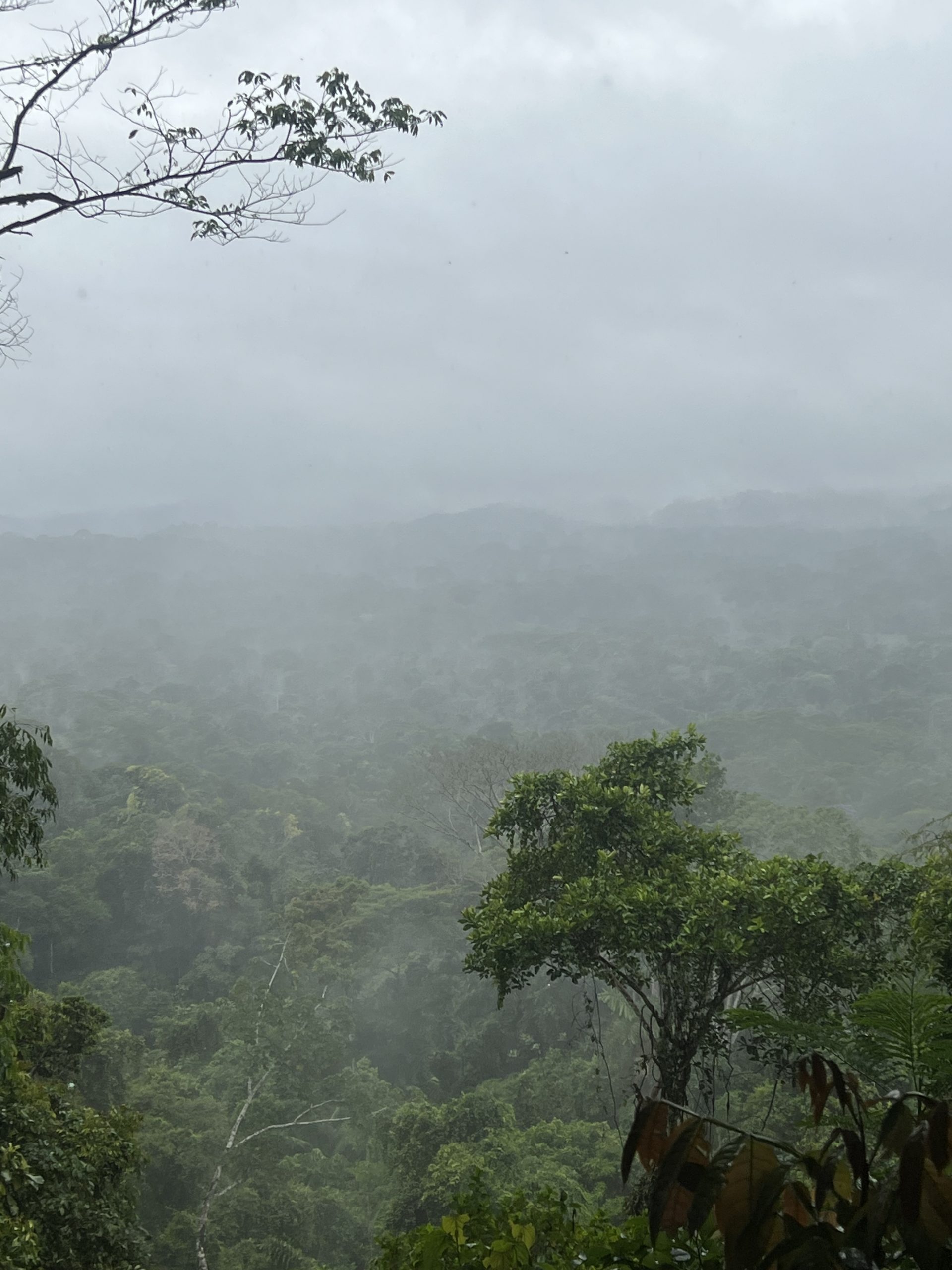 und dünnen Bäumen hinauf, der rote Lehm des Dschungelbodens ist glatt wie eine Eisbahn. Trotzdem kämpfen wir uns tapfer bis nach oben, wo es normalerweise eine wunderschöne, kilometerweite Aussicht über den Dschungel gibt. Nur heute leider nicht, alles was wir sehen ist dichter Nebel – Sehr schade, aber daran ist nichts zu ändern. Wir machen trotzdem