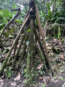 schwarze Kaiman könne bis zu 6 m lang und bis zu 300 kg schwer werden. Er wandert dann mit uns weiter durch den Dschungel, erklärt uns viele Pflanzen links und rechts des Pfades, zeigt uns „wandelnde“ Bäume die, sobald sie zu wenig Licht bekommen, an der Oberfläche Wurzeln bilden, mit deren Hilfe sie sich dann ein paar Zentimeter zur Seite bewegen,, um wieder Sonnenlicht zu erhalten, er läßt uns