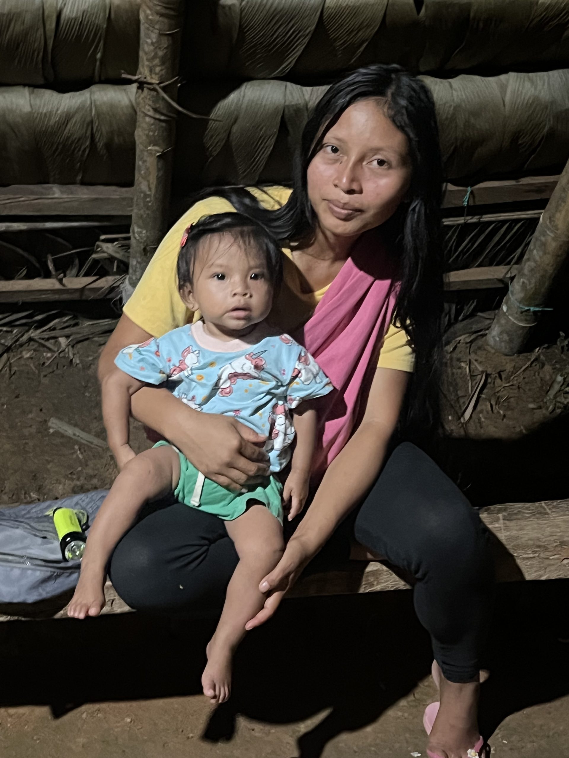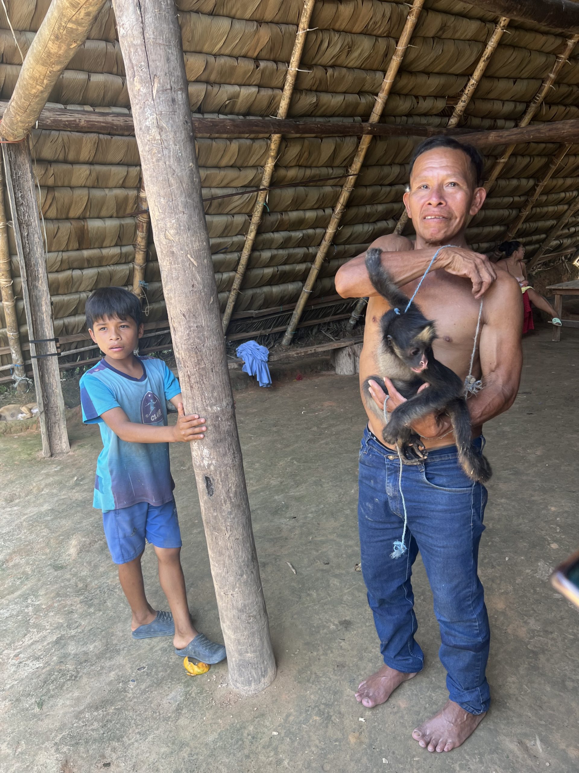 anderen er selbst mit seiner Frau und noch anderen Familienmitgliedern, die er uns alle vorstellt, aber so ganz bekommen wir nicht mit, wer jetzt was ist und wohin gehört. Egal, obwohl nur Gaya etwas spanisch spricht, empfangen uns alle sehr freundlich und heissen uns herzlich willkommen. Wir dürfen den Unimog auf einer ebenen Grünfläche abstellen und Gaya gibt gleich mal das Programm der nächsten Tage bekannt. Es scheint, als wolle er alles daransetzen, uns am Leben der Familie teilhaben zu lassen und es geht gleich damit los. Als wir nach einer kurzen Pause vor seiner Hütte auftauchen, erwartet er uns schon unter dem riesigen Dach, das praktisch das Wohnzimmer der Familie darstellt. Es ist von Gaya selbst gebaut, sieht aus wie ein hoher Dachstuhl, der direkt auf dem Boden aufliegt bzw. im Boden eingegraben wird, wasserdicht gedeckt mit einer Art großer Farne und an beiden Schmalseiten offen. Der Boden besteht aus gestampftem Lehm, der durch ständiges Kehren sauber