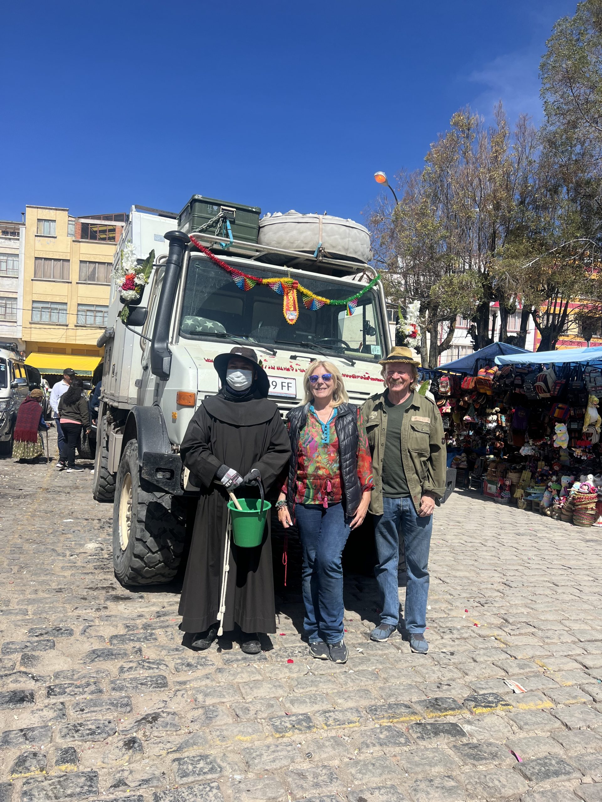 einem vorher schon diskret von der Blumenhändlerin zugeflüstert, was soll man sagen, die katholische Kirche überlässt auch hier lieber nichts dem Zufall, oder wahrscheinlich haben die Padres halt auch schon schlechte Erfahrungen mit den ewig knapp bei Kasse befindlichen Overlandern gemacht. Aber nicht nur den Segen der „Jungfrau von Copacabana“ gibt es hier, eine in der typischen, indigenen Landestracht gekleidete, bolivianische Frau versorgt den Unimog samt uns anschließend noch mit dem Segen der „Pachamama“, womit in großen Teilen Südamerikas die „Mutter Erde“ und somit die Natur und der Boden gemeint sind. Hier wird uns die dafür erwartete Spende im Anschluss von der Dame selbstbewusst direkt mitgeteilt und so, versorgt mit dem doppelten Segen, aber nur mehr knapp an weltlichen Bolivianos, machen wir uns auf den Weg zum nächsten Geldautomaten, um anschließend unsere Reise fortsetzen zu können.