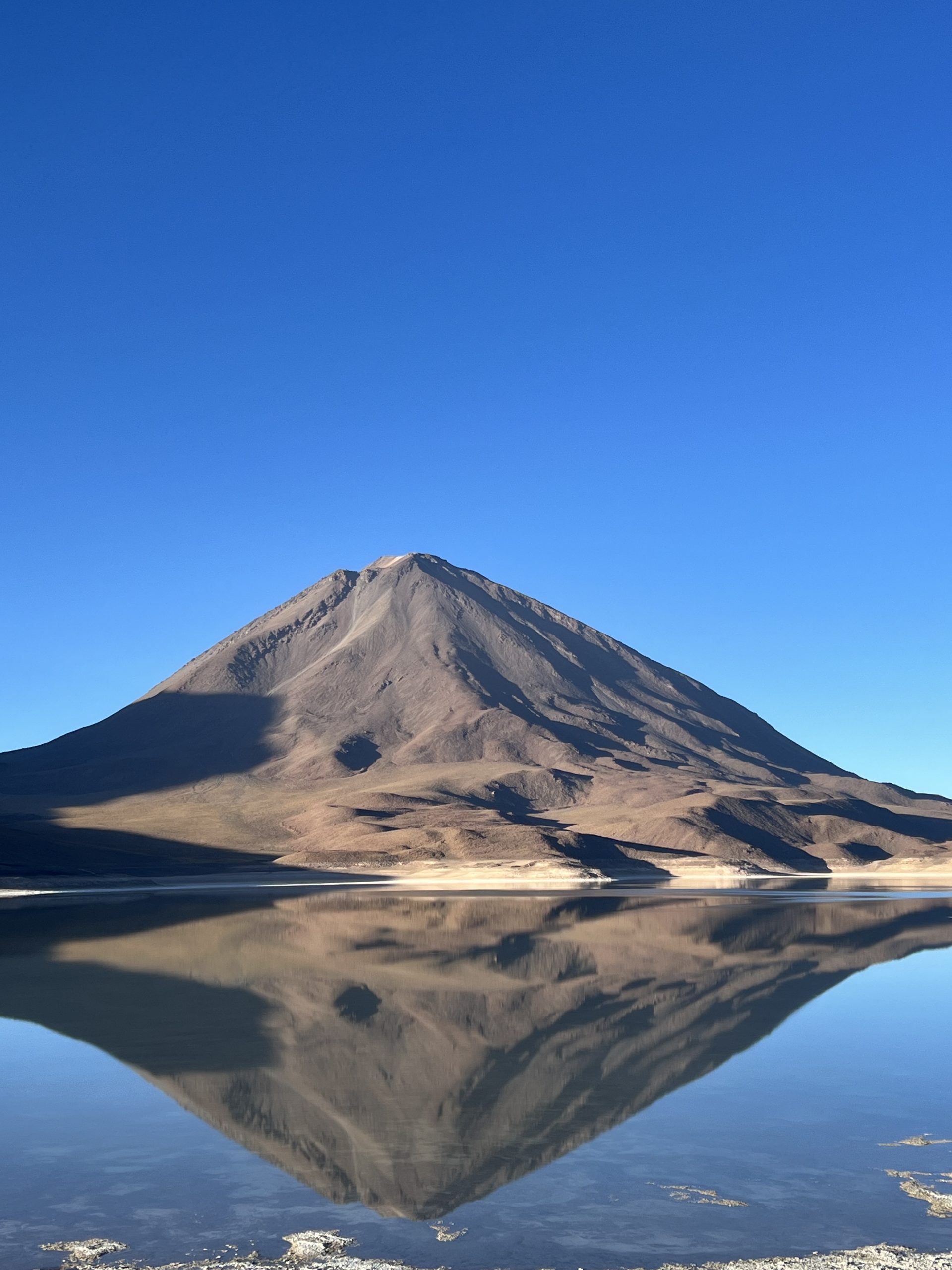„Übernachter“ sind. Dafür ist es auch hier am Abend wieder extrem windig und kalt, man braucht das Bier nachts inzwischen nicht mehr in den Kühlschrank zu stellen, es bleibt auch außerhalb richtig kalt. Am nächsten Morgen steige ich bereits bei Sonnenaufgang um 06.00 Uhr aus dem Bett, höre keinen Wind draußen und gehe etwas näher zum Rand der „Laguna verde“ und tatsächlich, es ist genau das eingetreten was ich erhofft hatte: Im klaren, völlig ruhigen Wasser der Lagune spiegelt sich in seiner ganzen Pracht